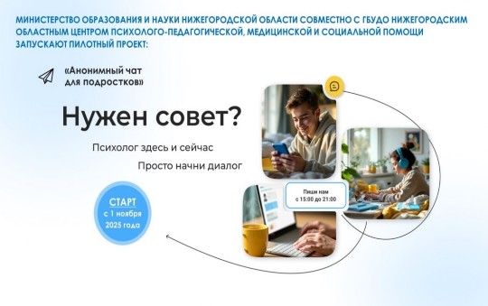 «Анонимный чат для подростков «Мы с тобой онлайн» Ссылка на платформу: https://мыстобойонлайн.рф/ 1 ноября 2025 года министерство образования и науки Нижегородской области совместно с Нижегородским областным центром психолого-педагогической, медицинской и социальной помощи запустили проект «Анонимный чат для подростков «Мы с тобой онлайн». Кто может написать в чат? Чат предназначен для детей и подростков в возрасте от 6 до 18 лет, обучающихся в школах или учреждениях СПО Нижегородской области. Каждый ребенок может анонимно написать в чат и получить поддержку! Что предлагает чат? • Возможность анонимно поделиться своими переживаниями со специалистами. О них никто не расскажет. • Советы по улучшению эмоционального состояния от профессиональных психологов-консультантов. Они смогут помочь тебе. • Помощь в выборе правильного направления действий для преодоления трудных ситуаций. Любая проблема разрешима, поверь. Не оставайся наедине со своими переживаниями! Мы здесь, чтобы поддержать тебя.